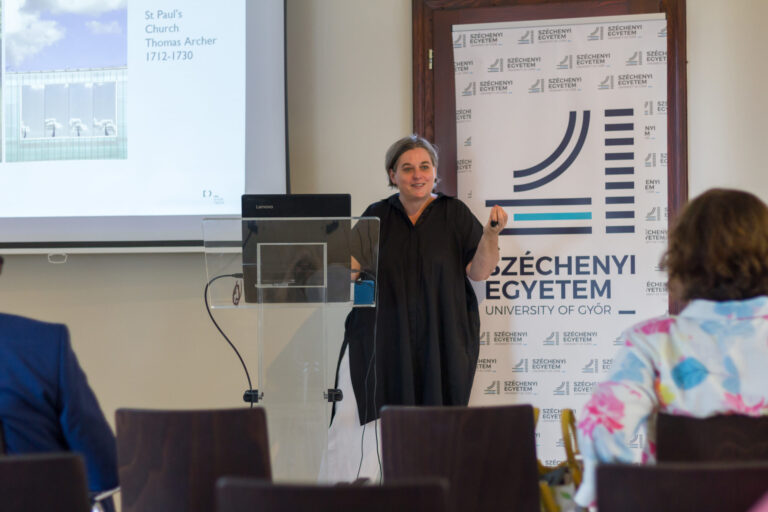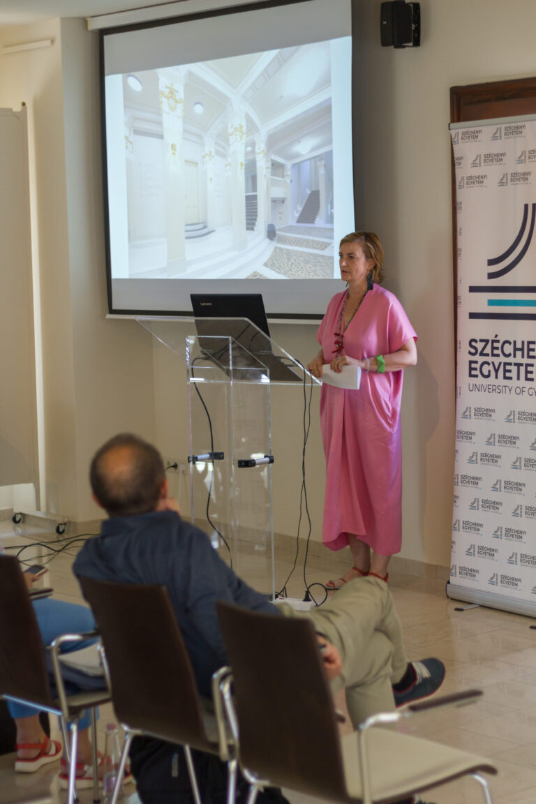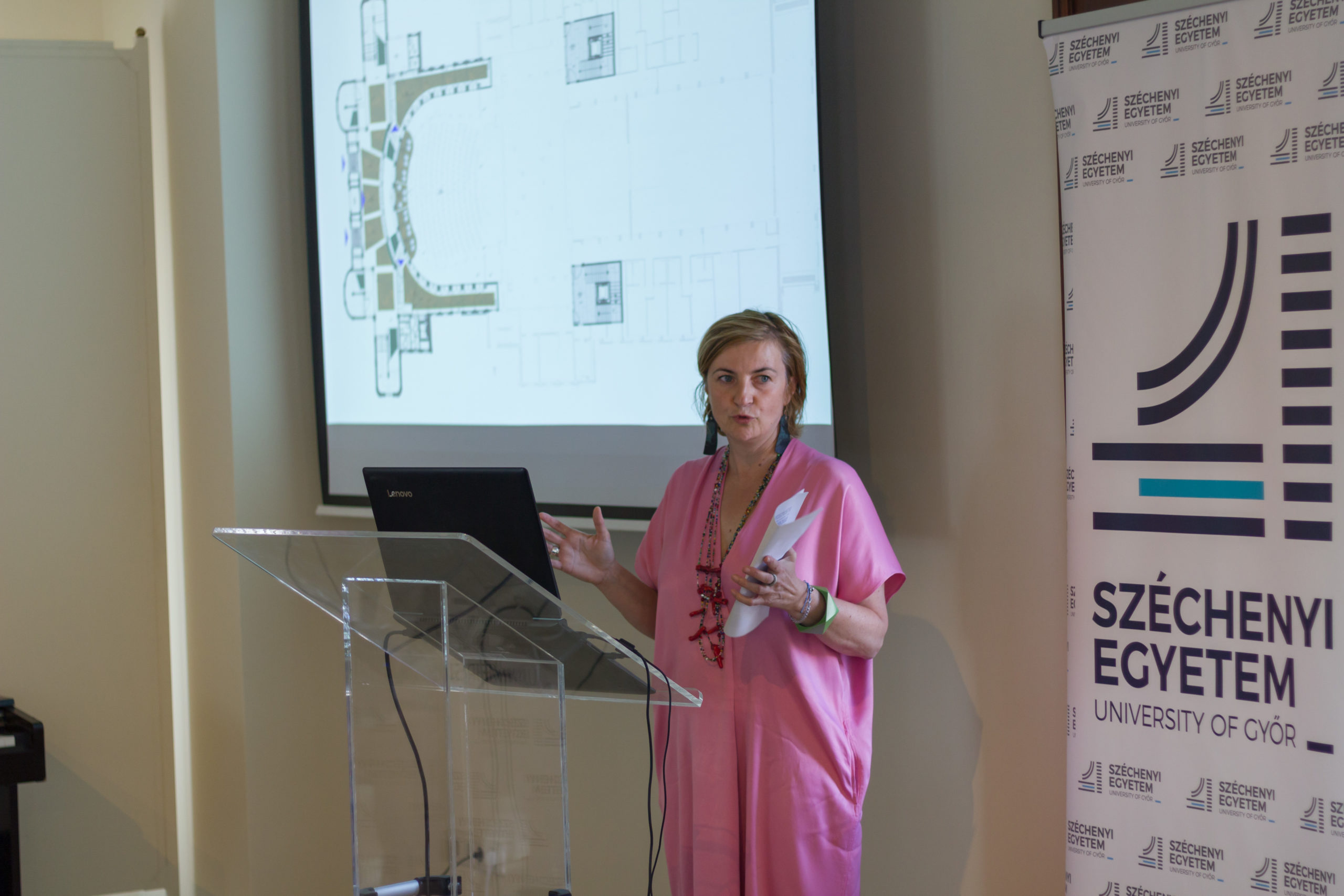 Somogyi Krisztina, a Széchenyi István Egyetem Művészeti Kar docense azt járta körbe prezentációjában, hogy milyen fontos tartalommal bír a test, a térforma és a mozgás összefüggése az építészetben. A transzdiszciplináris nézőpont szerint minden emberi élmény fizikai térben megy végbe és minden fizikai tér komponense az élménynek. Az előadó az épület, építészet recepcióját vizsgálta, amelynek fontos szempontjai, hogy mi a megítélés alapja, mire vonatkozik a kritika, miről és hogyan gondolkodunk az építészeti alkotással kapcsolatban, milyen viszonyban van az épület és az ember, ki ítéli meg. Hozzátette, az építészet közügy is, ezért fontos, hogy az emberek hogyan ítélik meg az adott épületet.