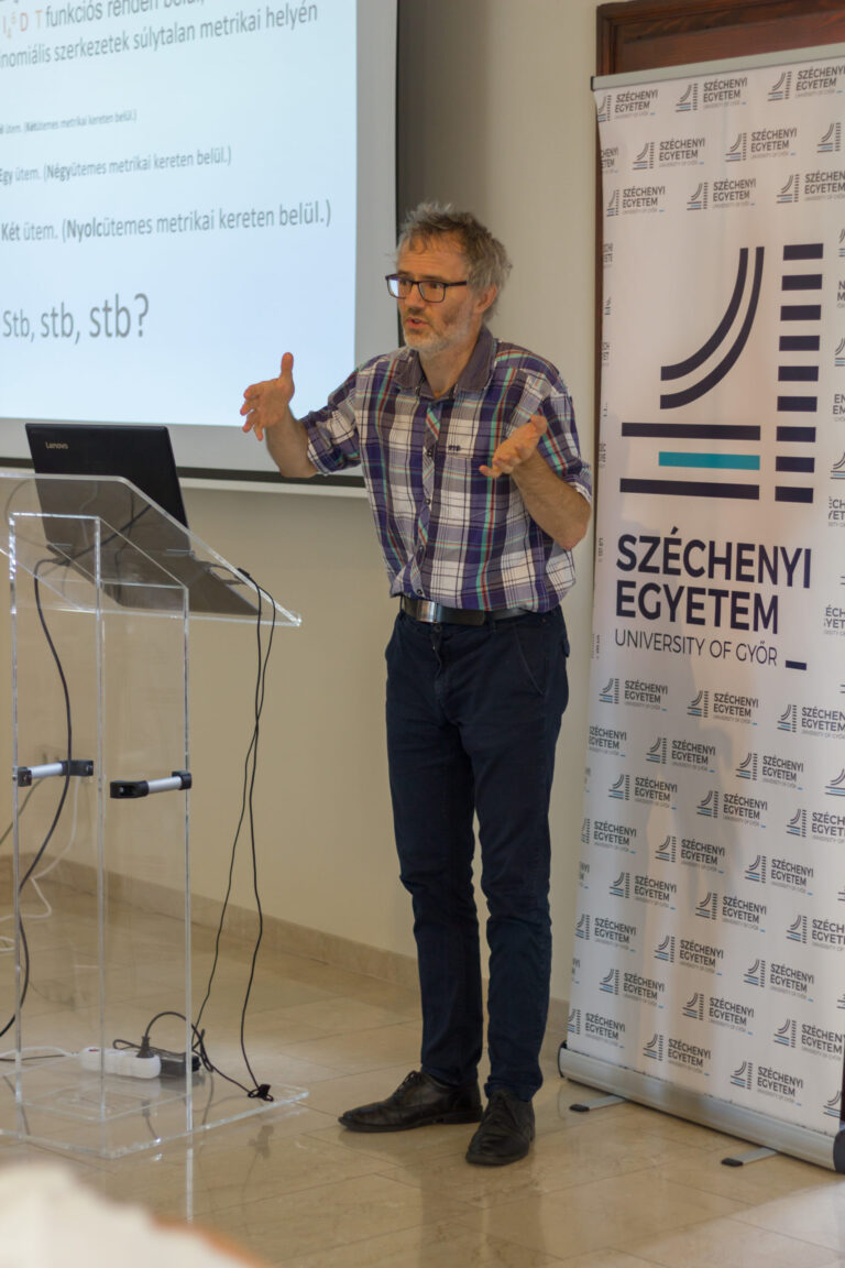Balázs Géza, az Eötvös Loránd Tudományegyetem, valamint a Színház- és Filmművészeti Egyetem tanára bemutatta, hogyan vált a nyelv a művészet kifejezőeszközévé. Elmondása szerint a mágia fogalma kiemelt szerepet játszik a nyelvészetben, hiszen a primitív természeti népek a nyelv, a szó erejét, hatását mágikusnak tartják. A nyelvhasználat alapvető rendeltetése örömszerzés, amely az egyes gondolatalakzatokban van kódolva, így a nyelvi kifejezőeszközök a különböző gondolkodási formák megnyilvánulásai, a nyelv kreatív megalkotásának technikái. Felhívta a figyelmet arra, hogy a nyelvben is jelen vannak az egyes zenei, ritmikai eszközök, amelyet a hétköznapokban megtalálható, akár az utcán bármikor szembejövő példákkal is alátámasztott.