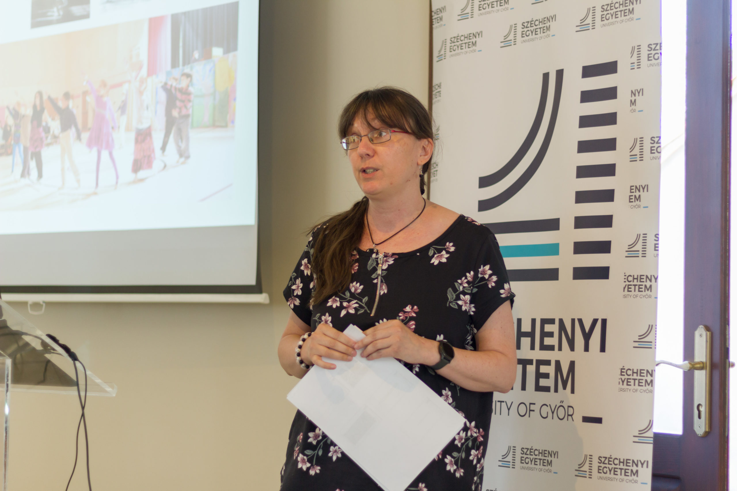 Szabó Adrienn, a Széchenyi István Egyetem Művészeti Kar művésztanára a zene és a táncgesztusok kapcsolatát elemezte a zenepedagógia területe felől. Az előadás elsődleges célja volt bemutatni, hogyan jelenik meg a szakmában a zene és a gesztusok kapcsolata – mint arra rávilágított, a reformpedagógiák megjelenésével egyre több példát találhatunk rá. Megvizsgálta, hogy a pedagógiában melyek azok az irányzatok, ahol kiemelten fontos a zene és a mozgás kapcsolata. A reformpedagógiákhoz sorolta Kodály Zoltánt koncepcióját is, aki felhívta a figyelmet arra, hogy lehetőleg már óvodában is foglalkozzunk a zenei neveléssel; de ugyanitt említette meg Kokas Klára módszerét is.