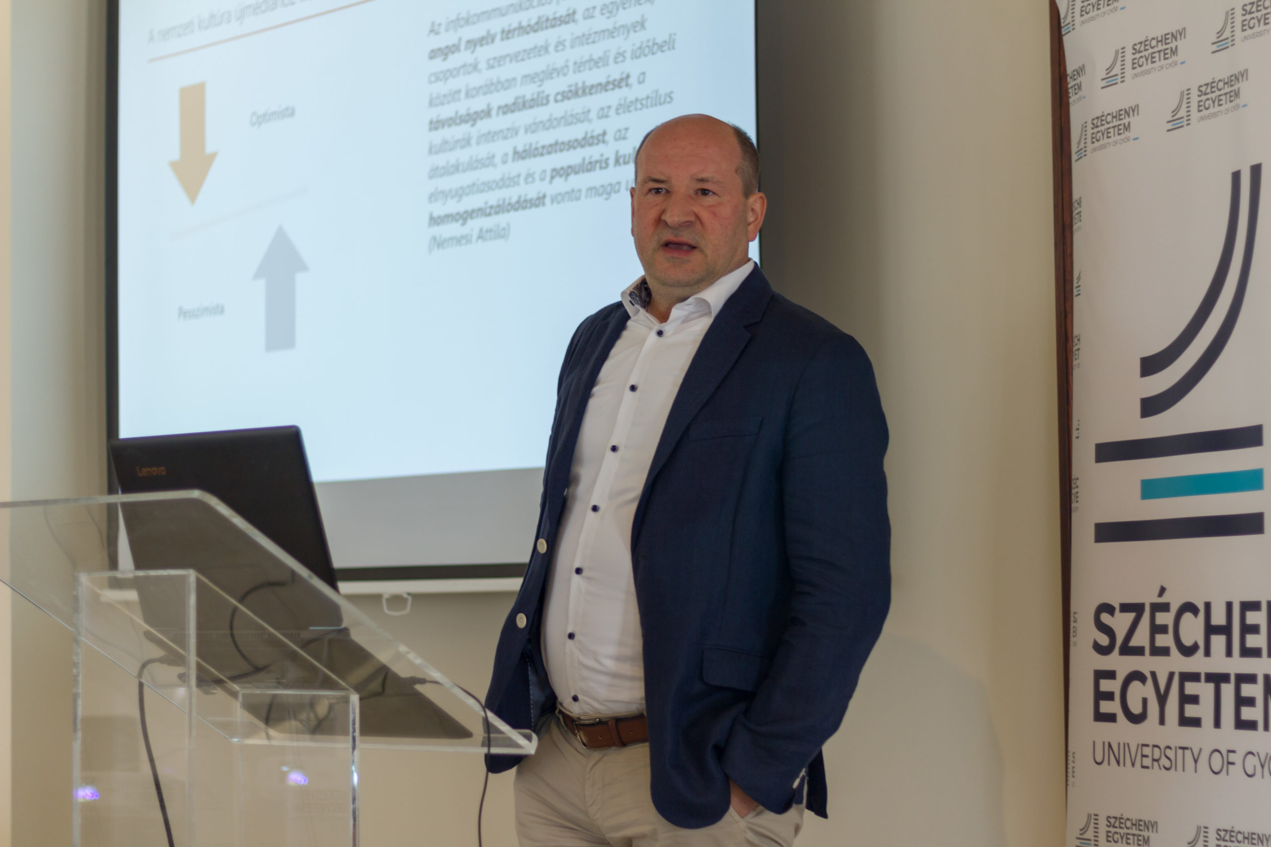 Antal Zsolt, a Színház- és Filmművészeti Egyetem Elméleti Intézet igazgatója mindenekelőtt a kultúra közvetítő közegéről, azaz olyan intézményekről szólt, akik részt vesznek az értékek létrehozásában, megőrzésében, közvetítésében. Mint azt kifejtette, a globalizáció és a kommunikációs technológiák robbanásszerű fejlődése soha nem látott kihívások elé állította a kulturális örökség megőrzéséért és fenntartásáért felelős államokat és intézményeket. A digitális tartalomgyártás során kulcsszerephez jutottak az értékmegőrzést magukra vállaló intézmények. Hogyan határozható meg a nemzeti kultúra fogalma? Ki és hogyan képviseli a digitális korban? Milyen eszközök állnak ehhez rendelkezésre? Milyen pozitív és negatív erők befolyásolják? Az előadás többek közt ezekre a kérdésekre keresett választ.