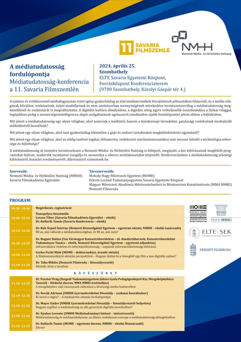 A médiatudatosság fordulópontja című konferencia társszervezője a Moholy-Nagy Művészeti Egyetem, az Eötvös Loránd Tudományegyetem Savaria Egyetemi Központ, a Magyar Művészeti Akadémia Művészetelméleti és Módszertani Kutatóintézet és a Nemzeti Filmiroda.