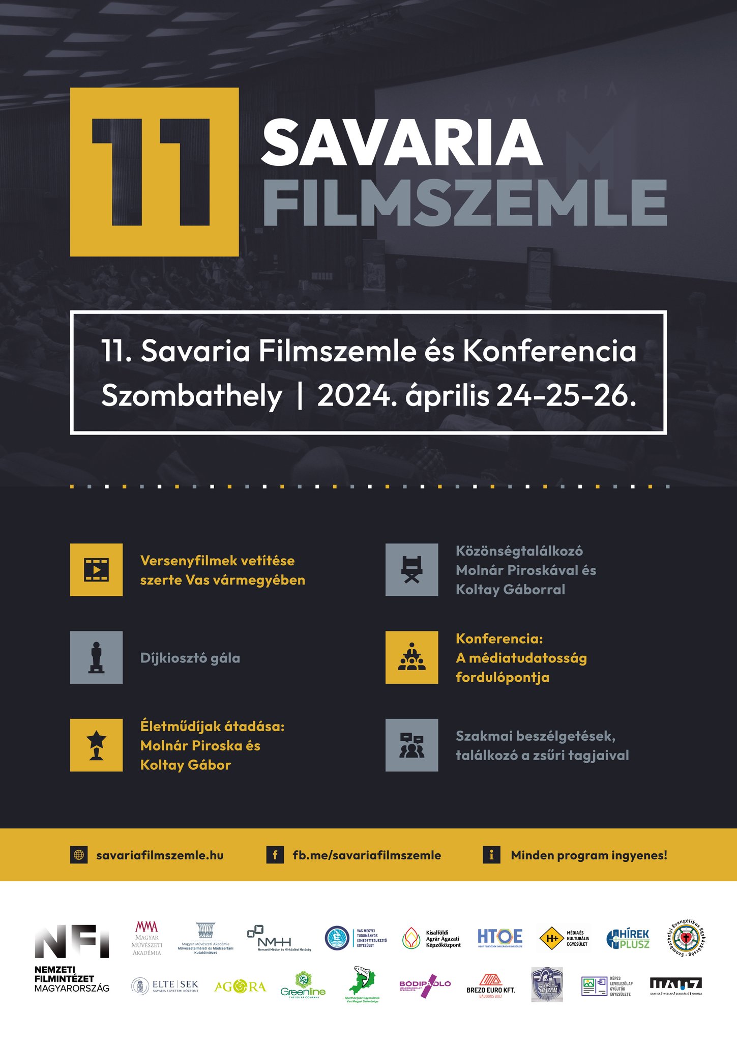 Tizenegyedik alkalommal rendezik meg április 24. és 26. között a Savaria Filmszemlét Szombathelyen. A filmvetítések, közönségtalálkozók és díjkiosztó gála mellett a filmszemléhez kapcsolódóan április 25-én szervezi meg a Nemzeti Média- és Hírközlési Hatóság és a Savaria Filmakadémia Egyesület azt a szakmai konferenciát, amelynek fókuszában a médiatudatosság áll, s amelynek társszervezője a Magyar Művészeti Akadémia Művészetelméleti és Módszertani Kutatóintézet.