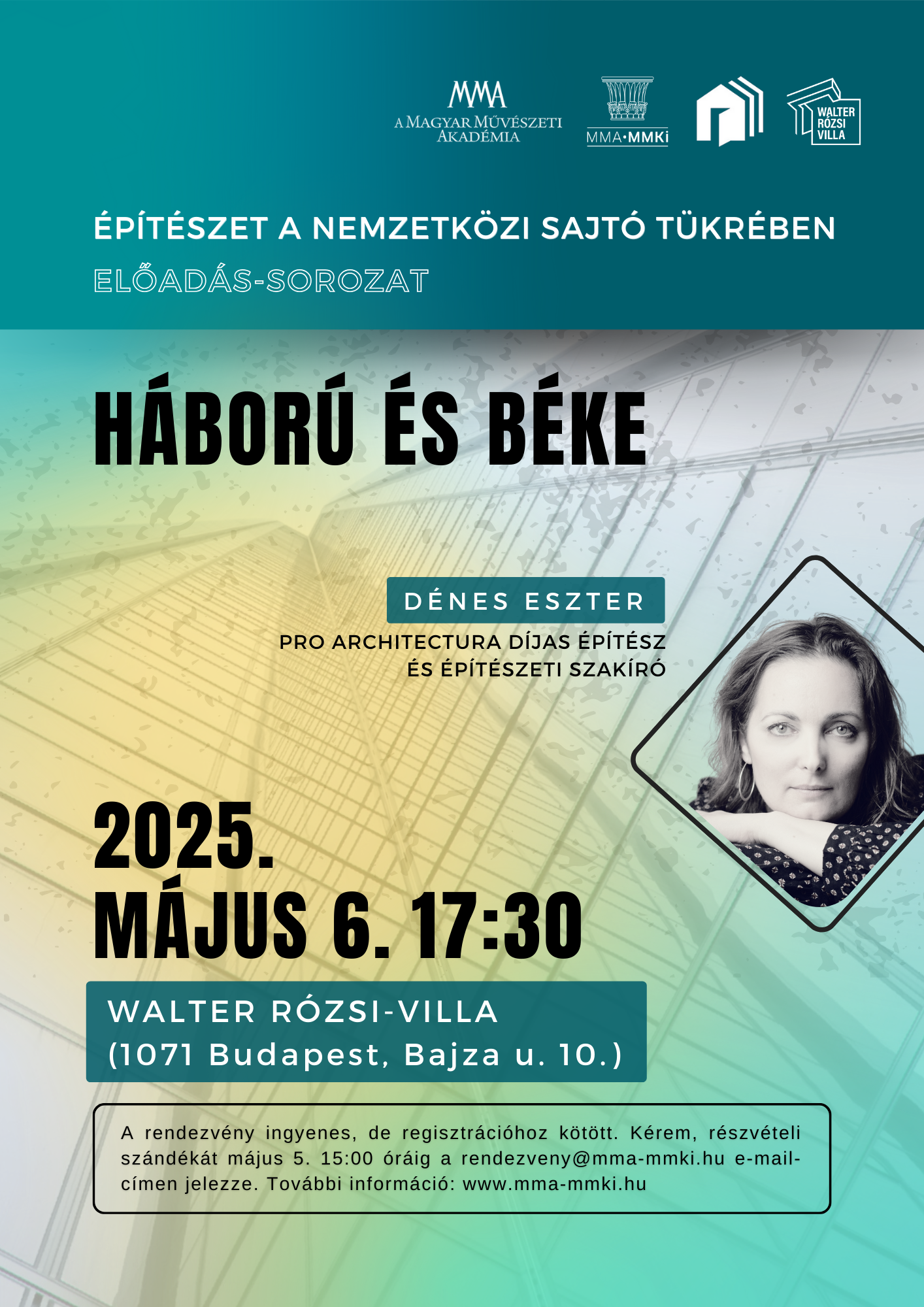 A szakember május 6-i előadásának címe: Háború és béke. A 17 óra 30 perckor kezdődő előadás arra a kérdésre ad választ, hogy vajon mi lehet az építészet feladata a háború, a természeti- és humanitárius katasztrófák metszetében? Miben áll és hogyan bontakozott ki az elmúlt évek alkotásaiban Japántól a Közel-Keleten át Európáig bezárólag a közösség iránti felelősség, mint szakmaetikai norma? Gondolatok, jó gyakorlatok, kérdések a nagyvilágból, a nemzetközi sajtó tükrében.