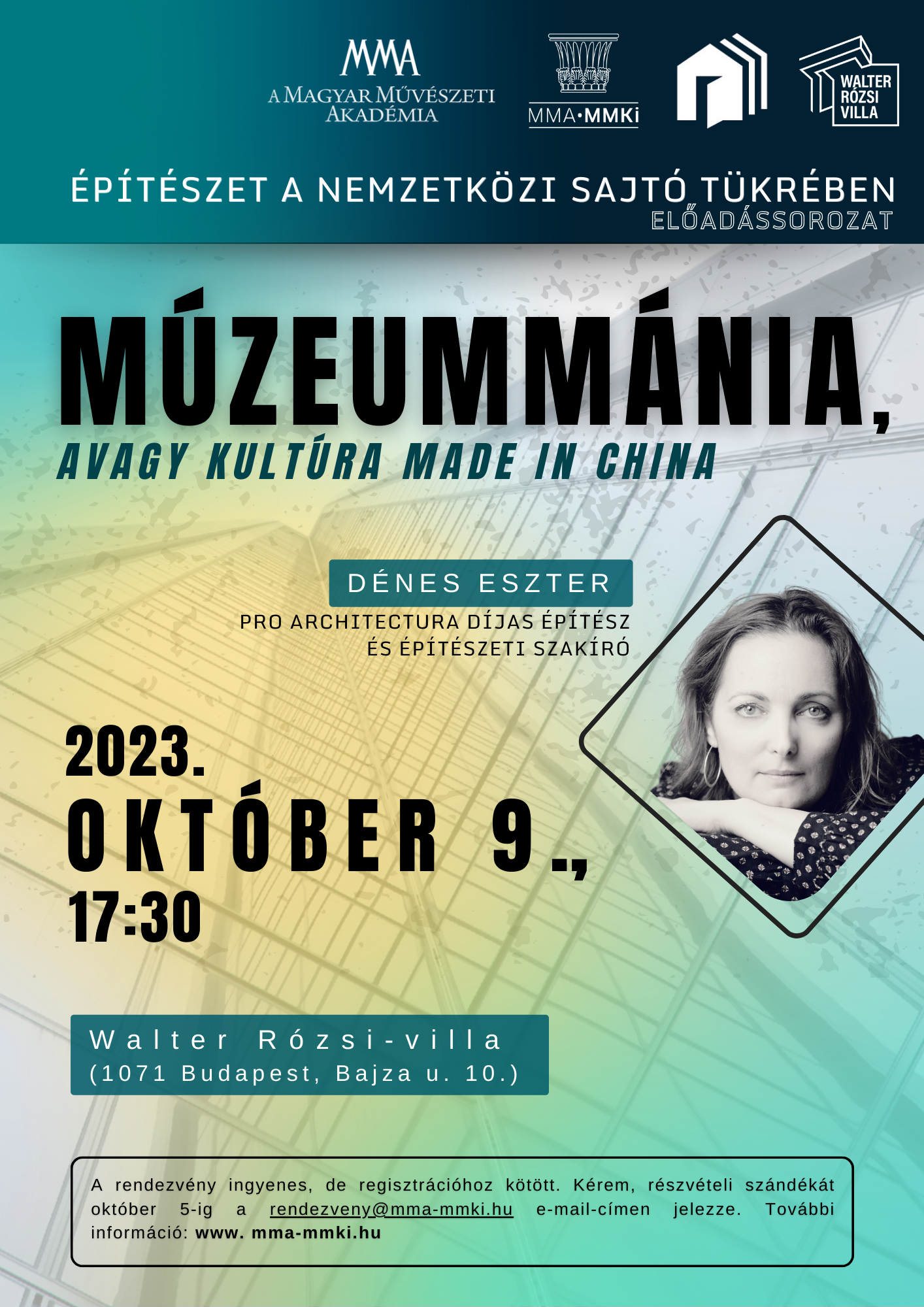 Az MMA Művészetelméleti és Módszertani Kutatóintézet (MMA MMKI) szervezésében október 9-én veszi kezdetét Dénes Eszter Építészet a nemzetközi sajtó tükrében című előadássorozata, amelynek a Walter Rózsi-villa ad otthont.