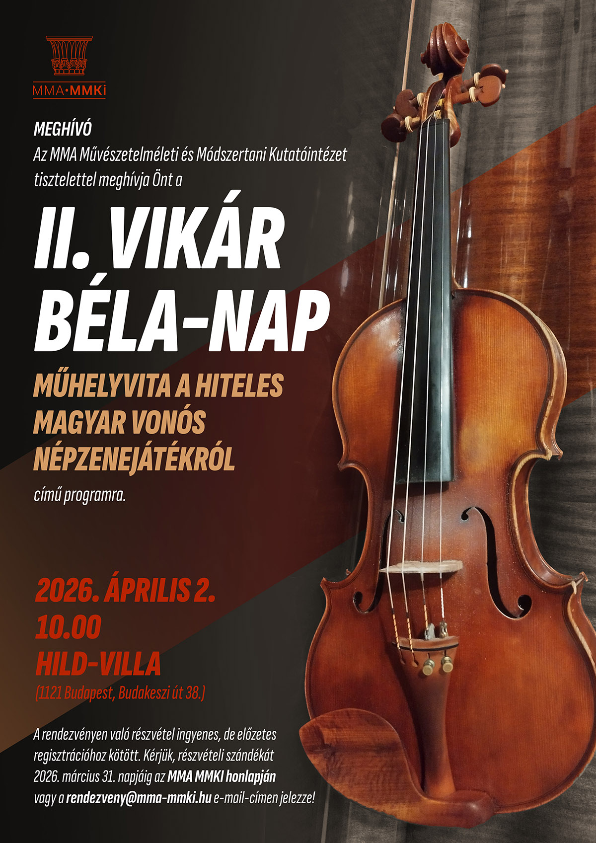 A Magyar Művészeti Akadémia Művészetelméleti és Módszertani Kutatóintézet (MMA MMKI) tisztelettel meghív minden érdeklődőt 2026. április 2-án 10 órától a Hild-villába a II. Vikár Béla-nap – műhelyvita a hiteles magyar vonós népzenejátékról című programjára.